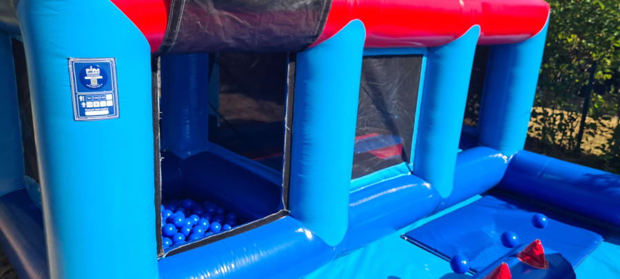 - Inflatable compound featuring a bouncy castle, ball pool, and slide