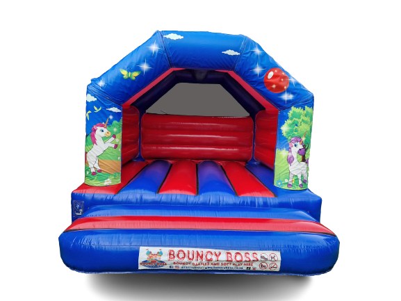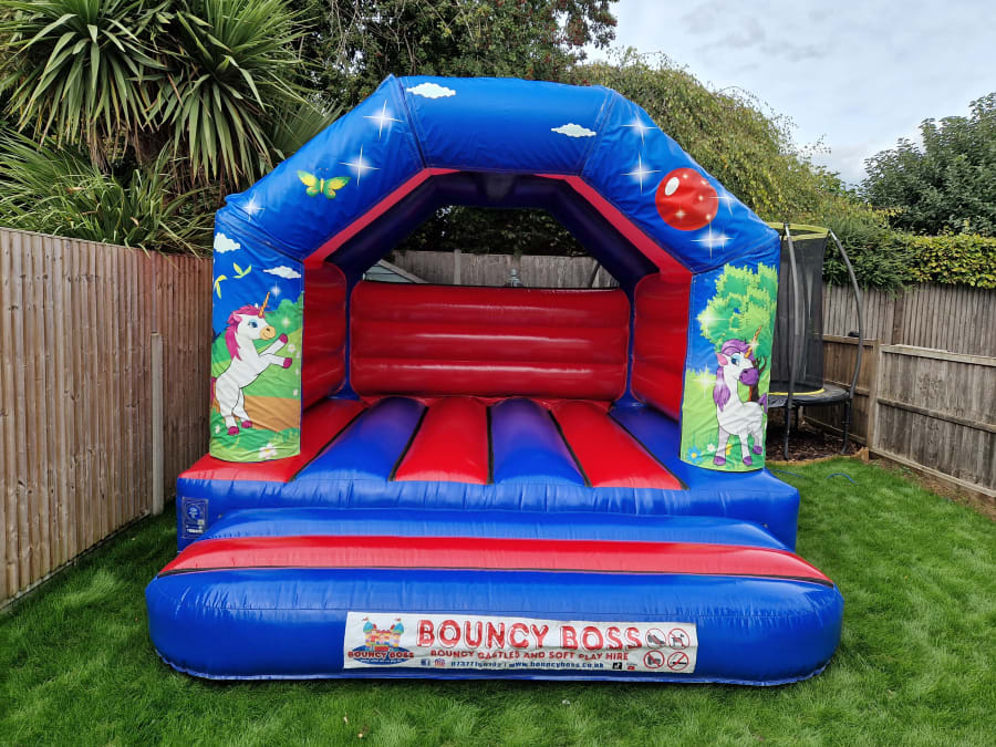 Book now and bring a touch of magic to your next event with our unicorn themed red and blue bouncy castle!