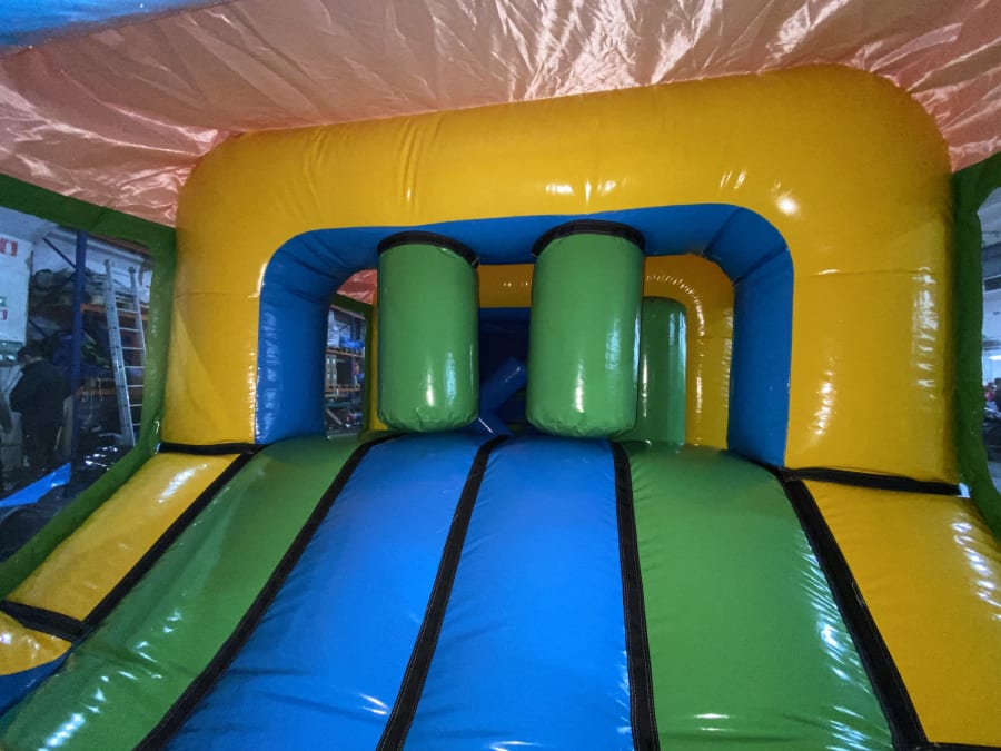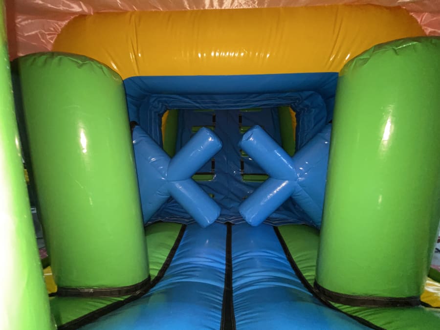💥 Pass through the inflatable X-shaped bish bash obstacles, testing your agility and determination. Scale the steps with confidence and anticipation, knowing that the heart-pounding descent down the 7.7ft slide awaits you at the end.