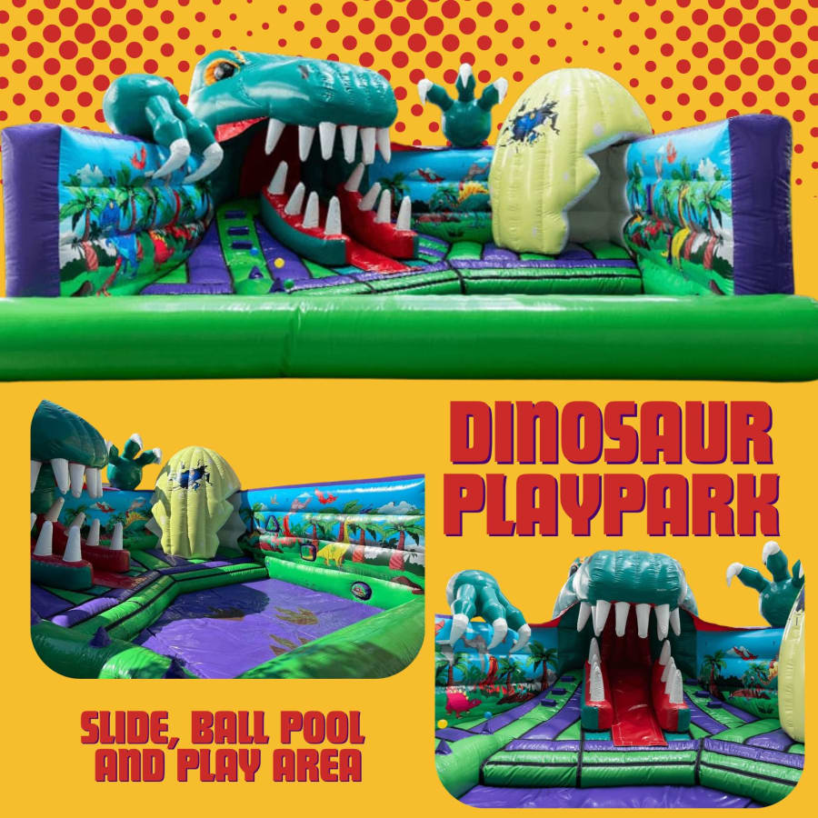 Looking for something to entertain your Dinosaur obsessed little one? Look no further than our roarsome dinosaur inflatable play park. This spectacular inflatable has it all with a large bouncing area. You can play hide and seek in a pre historic dinosaur egg. Slide straight out of the T- Rex mouth into a fun filled ball pool or play with our soft play shapes hidden within the inflatable walls. This is your all in one party solution. This bouncy castle has something for everyone and is the perfect showstopper for your birthday celebrations.