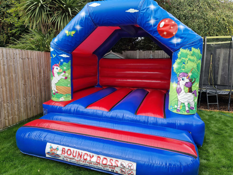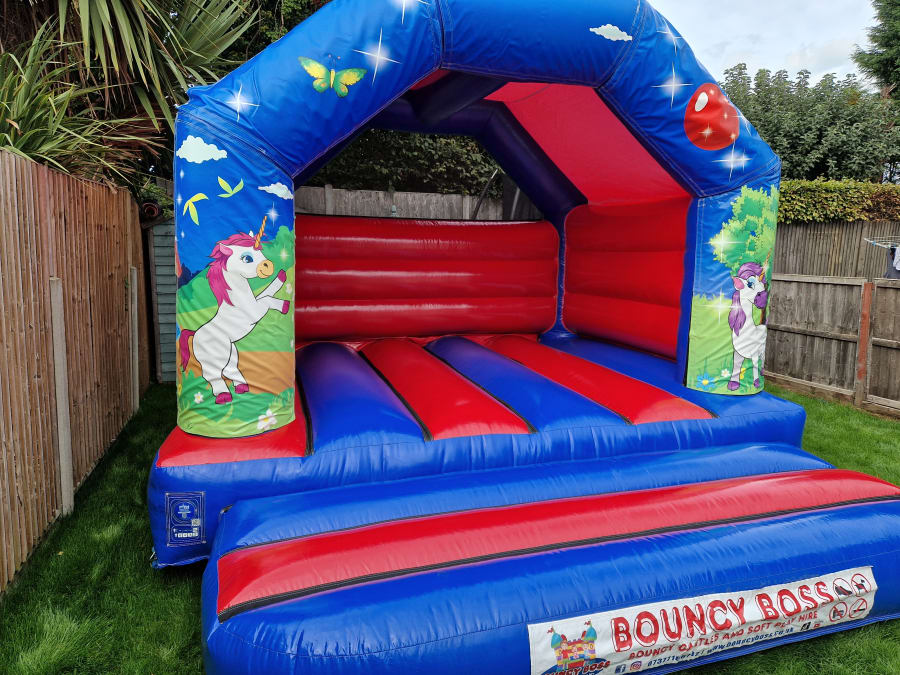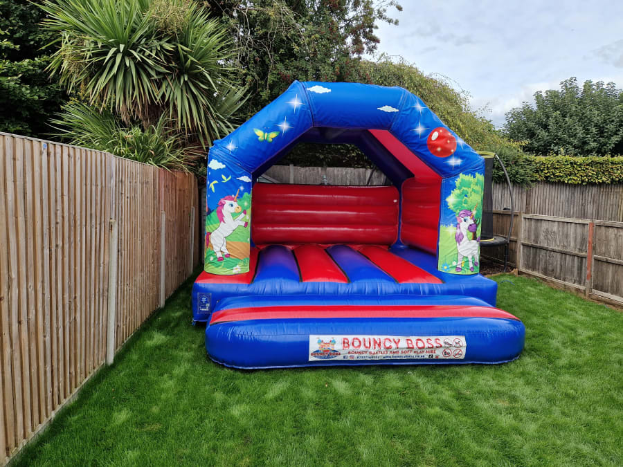Book now and bring a touch of magic to your next event with our unicorn themed red and blue bouncy castle!