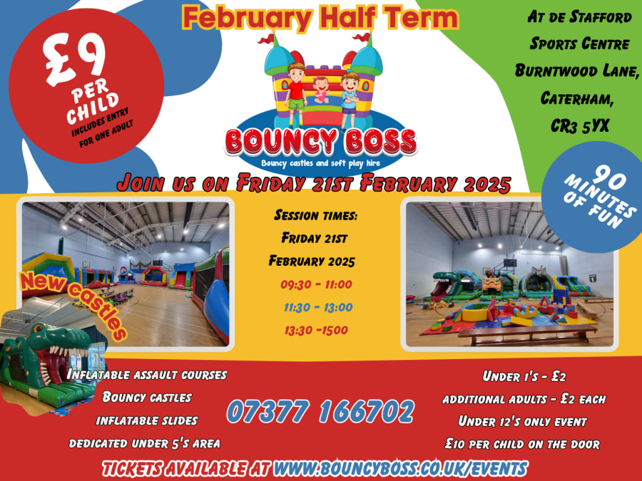 Looking for ideas to entertain the kids this April Half Term? Children's fun day out in Caterham. This Half Term Event for Children is packed with inflatable fun. We hand select our customers favourite inflatables and bring them all together for a fun day out with the kids. This event is suitable for children under 12. We have a dedicated under 5s area which includes soft play and our smaller inflatables. The rest of the hall will contain large bouncy castles including our large assault course, our smaller assault course's, large bouncy castles and a huge inflatable slide. With at least 8 inflatables to bounce and slide on you will be spoilt for choice. We recommend booking asap as we do have a maximum capacity. We will not allow over crowding as safety is our first priority, we also want to ensure that all children get the maximum enjoyment. The event is held at De Stafford Sport Hall in Caterham. If you are looking for days out in Surrey then look no further. A short drive from Croydon and in the centre of our delivery area (Warlingham, Sanderstead, Kenley, Oxted).