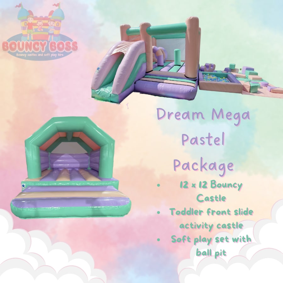 Book a show-stopping combo for every age. The Dream Mega Pastel Package blends a large 12 x 12 open-front bouncy castle, a toddler front-slide castle with bish bash column and hoop and slide, plus a modular soft play set and ball pit. Perfect for mixed-age parties from crawlers to early teens. Aesthetically pleasing pastel lilac, mint, peach and pink make it versatile for birthdays, baby showers, and family celebrations. π